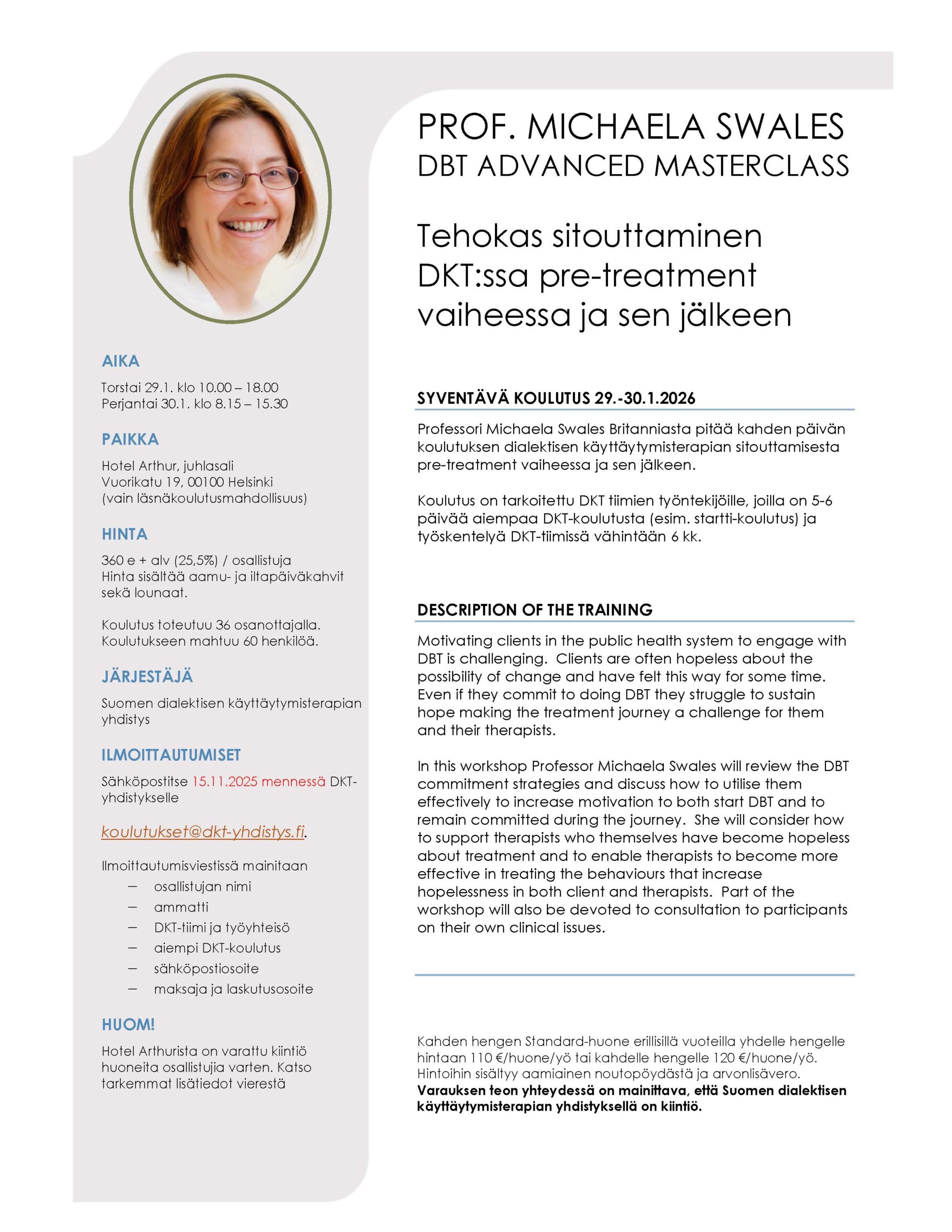 Professori Michaela Swales Britanniasta pitää kahden päivän koulutuksen dialektisen käyttäytymisterapian sitouttamisesta pre-treatment vaiheessa ja sen jälkeen.